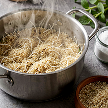 Do garnka z quinoa wlej 360 ml wody (stosunek 1:2), dodaj 1 gram soli, doprowadź do wrzenia na dużym ogniu. Gdy woda zacznie wrzeć, zmniejsz ogień do małego, przykryj pokrywką i gotuj 12–15 minut, aż ziarna wchłoną wodę. Po ugotowaniu zdejmij pokrywkę i odstaw na 5 minut, następnie spulchnij widelcem — quinoa powinna być sypka, z widocznymi 'spiralnymi ogonkami'.