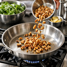 Prażenie orzechów: rozgrzej suchą patelnię na średnim ogniu (bez oleju). Wsyp orzech włoski i praż przez 2-4 minuty, potrząsając patelnią co kilkanaście sekund, aż poczujesz orzechowy aromat i zobaczysz lekko przyciemnione brzegi. Po ostudzeniu posiekaj grubo na mniejsze kawałki nożem.