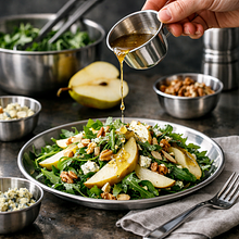 Lekka, zimowa sałatka łącząca pieczone/w świeżej wersji soczyste gruszki, pikantną rukolę oraz chrupiące orzechy włoskie z kremowym serem pleśniowym i prostym dressingiem na bazie oleju rzepakowego i cytryny. Danie łączy kontrasty: gorzka zielenina, słodycz gruszki, tłustość orzechów i wyrazistość sera. To nowoczesna, polska interpretacja sałatki komponująca lokalne składniki, idealna jako przystawka, lekki obiad lub dodatek do pieczonej kaczki. Podawaj natychmiast po skomponowaniu, aby rukola pozostała świeża i chrupiąca; oszczędne polanie sosem zachowa strukturę dodatków. Sałatka dobrze sprawdza się na przyjęciach, kolacjach i śniadaniach weekendowych.