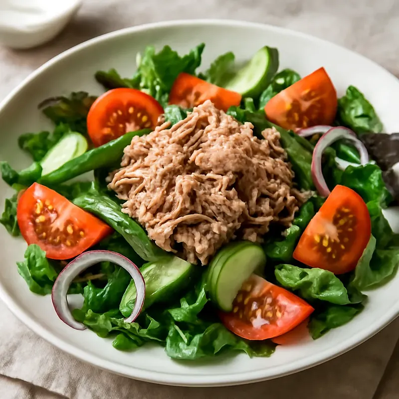 Klasyczna, aromatyczna sałatka z tuńczykiem — lekka, kremowa i jednocześnie świeża, idealna jako jedno z dań na wigilijnym stole. Łączy delikatne kawałki tuńczyka w sosie własnym z ugotowanymi ziemniakami i marchewką, chrupiącymi ogórkami kiszonymi oraz cebulką, wszystko spięte kremowym sosem majonezowo-musztardowym z nutą cytryny. Sałatka ma kontrast tekstur: miękkie warzywa, soczystość tuńczyka, kwasowość ogórków i pikantność cebuli. Wizualnie prezentuje się przyjemnie — kremowa masa z zielonym akcentem koperku i ewentualnie kaparami. Doskonała do podawania w misce lub na pojedynczych talerzach, można ją podać z ciemnym pieczywem lub jako część szwedzkiego stołu. Świetnie sprawdzi się na Wigilię, szczególnie dla osób, które preferują dania rybne zamiast mięsnych.