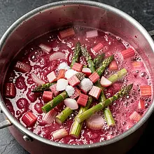 Wykwintne, wiosenne danie w stylu mazurskim: delikatny sandacz pieczony pod słodko-kwaśnym chutney z rabarbaru oraz podany z chrupiącymi młodymi szparagami i aromatycznym szczawiem. Chutney dodaje potrawie świeżości i lekkiej kwaskowości, która przełamuje tłustość masła użytego do pieczenia, a zielone szparagi i szczaw nadają kolor i wiosenny charakter. Potrawa idealnie sprawdzi się jako danie główne podczas rodzinnego obiadu lub świątecznego spotkania wiosną; pasuje z pieczonymi młodymi ziemniakami lub lekką kaszą jaglaną. Wizualnie efektowna: różowy chutney rabarbarowy, złocista skórka sandacza i zielone pędy szparagów tworzą harmonijną kompozycję na talerzu.