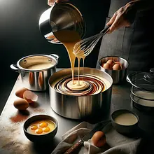 Do gładkiego serka dodaj 240 g jajek (pojedynczo lub w dwóch turach), miksując krótko po każdym dodaniu, tylko do połączenia. Następnie wlej 200 ml śmietany 30% i 10 g ekstraktu waniliowego; mieszaj przez 20-30 sekund na niskich obrotach. Przesiej 20 g mąki i 10 g skrobi kukurydzianej bezpośrednio do masy i wmieszaj na najniższych obrotach do całkowitego połączenia — masa powinna być gładka, lekko gęsta i lśniąca.