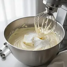 W dużej misie miksera umieść twaróg, serek mascarpone, cukier puder, skrobię ziemniaczaną oraz 400g masy kajmakowej. Używając końcówki do mieszania (płaskiej, nie trzepaczki), miksuj na najniższych obrotach tylko do momentu połączenia się składników w gładką masę. Nie miksuj zbyt długo ani na wysokich obrotach, aby nie napowietrzyć masy.