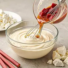 Na masie serowej rozłóż po około 50–70 g wystudzonego kompotu rabarbarowego (ilość zależy od tego, czy lubisz więcej owoców). Możesz zostawić część kompotu do polania przed podaniem.
