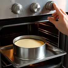 Dobrym sposobem zapobiegania spękaniom jest pieczenie w kąpieli wodnej — umieść formę owiniętą folią aluminiową w większej brytfannie z gorącą wodą do 1/3 wysokości formy. Jeśli nie używasz kąpieli, obniż temperaturę zgodnie z powyższym wskazaniem i nie otwieraj piekarnika w pierwszych 40 minutach.
