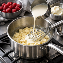 Rozpuść białą czekoladę: w małym rondelku podgrzej 100 ml śmietany (nie dopuszczaj do wrzenia — ma być gorąca, dopiero zaczynająca parować). Zdejmij z ognia, dodaj połamaną białą czekoladę i mieszaj drewnianą łyżką aż czekolada się rozpuści i powstanie gładka, lśniąca masa. Odstaw do lekkiego przestudzenia (do około 40–45°C) — masa nie powinna być gorąca przy łączeniu z żelatyną i twarogiem.