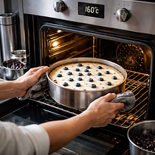 Delikatny, wilgotny sernik z intensywnym sosem z borówek — klasyczne polskie ciasto w nowoczesnej odsłonie. Spód na maślanym kruchym cieście daje kontrast tekstur, masa serowa jest kremowa dzięki dobrze odtłuszczonemu twarogowi i jajkom, a świeży sos z borówek dodaje kwaskowo-słodkiej świeżości. Doskonały na wiosenne spotkania, świąteczne stoły i popołudniowe herbaty; komponuje się z kremową bitą śmietaną lub filiżanką mocnej kawy. Estetycznie prezentuje się z połyskującymi borówkami na wierzchu i cienką skórką cytrynową jako dekoracją.