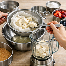 Przygotuj masę serową: odsącz tofu z nadmiaru płynu (jeśli jest w opakowaniu) i przełóż do blendera kielichowego. Dodaj do blendera jajka, pozostały cukier (ok. 60 g), śmietanę 18%, ekstrakt waniliowy, resztę soku z cytryny oraz szczyptę soli. Blenduj na wysokich obrotach 1,5–2 minuty, aż masa będzie całkowicie gładka, jedwabista i bez grudek.