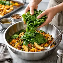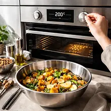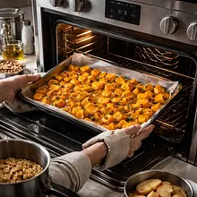Rozgrzej piekarnik do 200°C (góra-dół) z funkcją termoobiegu jeśli jest dostępna. Przygotuj blachę wyłożoną papierem do pieczenia. Dynię obierz obieraczem do warzyw (jeśli używasz hokkaido możesz zostawić skórę) i przekrój na pół. Usuń nasiona łyżką, a następnie pokrój miąższ na kostkę o boku około 2 cm — równe kawałki upieką się równomiernie. Ułóż kawałki dyni na blasze, skrop 25 g oliwy z oliwek, lekko posól (ok. 2 g) i delikatnie wymieszaj ręką lub silikonową szpatułką tak, aby każdy kawałek był pokryty tłuszczem.