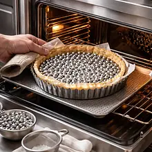 Przygotuj kruchy spód. Do dużej miski przesiej 250 g mąki pszennej, dodaj 1 g soli i 40 g cukru białego. Wymieszaj suche składniki łyżką. Zimne masło 100 g pokrój w kostkę (ok. 1 cm). Dodaj masło do mąki i rozcieraj palcami (lub użyj siekacza do ciasta) aż mieszanina przypominać będzie gruboziarnistą bułkę tartą z kilkoma większymi kawałkami masła - to ważne, bo kawałki masła dadzą kruchość. Wbij 1 jajko (60 g) i dodaj stopniowo 30 ml zimnej wody. Delikatnie mieszaj drewnianą łyżką, a gdy zacznie się łączyć, przenieś na lekko podsypaną mąką powierzchnię i szybko zagnieć 8-12 razy, tylko do momentu gdy ciasto połączy się w zwartą kulę; nie wyrabiaj długo. Uformuj dysk, owiń folią i włóż do lodówki na minimum 30 minut.