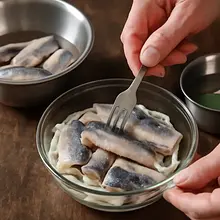 Sprawdź filety śledziowe: jeśli mają skórę, możesz ją zostawić lub zdjąć. Ułóż filety w dużej misce i opłucz pod zimną bieżącą wodą, aby pozbyć się nadmiaru soli i ewentualnych łusek. Następnie zalej filety zimną wodą tak, aby były całkowicie przykryte. Odstaw do moczenia na 1,5-2 godzin w lodówce, zmieniając wodę co 30-40 minut. Po moczeniu osusz filety ręcznikiem papierowym i pokrój je w kawałki o szerokości 3-4 cm (na porcje do kanapek).