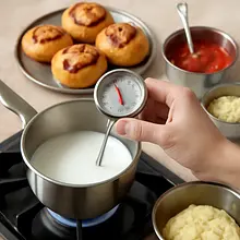 Przygotuj rozczyn: podgrzej 120 ml mleka do temperatury około 35-38°C (powinno być wyraźnie ciepłe, ale nie gorące — sprawdź przy pomocy dłoni). Pokrusz 20 g świeżych drożdży do małej miseczki, dodaj 10 g cukru (z całkowitej ilości), wlej ciepłe mleko i delikatnie wymieszaj widelcem do rozpuszczenia drożdży. Odstaw w ciepłe miejsce na 10-12 minut — na powierzchni powinny pojawić się pęcherzyki i pianka, co oznacza aktywację drożdży.
