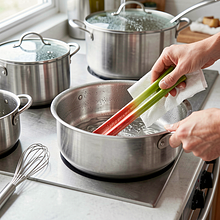 Umyj rabarbar pod chłodną, bieżącą wodą i osusz papierowym ręcznikiem. Odetnij zdrewniałe końcówki (ok. 1–2 cm). Jeśli łodygi są bardzo grube lub włókniste, obierz cienko zewnętrzną warstwę nożykiem do warzyw — prowadź nóż wzdłuż łodygi, usuwając tylko włóknistą skórkę.