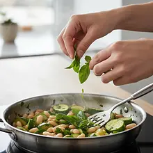 Oto danie, które jest kwintesencją lata zamkniętą na talerzu! Słoneczna Cukinia z Białą Fasolą i Ziołami to lekki, niezwykle aromatyczny i pożywny posiłek, który przygotujesz w jednym garnku w mniej niż 30 minut. Inspirowany śródziemnomorskimi smakami, łączy w sobie delikatną słodycz młodej cukinii, kremową konsystencję białej fasoli oraz eksplozję świeżości od pomidorków koktajlowych i świeżych ziół. Potrawa jest nie tylko pyszna, ale również piękna – mieni się kolorami zieleni, czerwieni i bieli. To idealna propozycja na szybki obiad, lekką kolację lub jako dodatek do grillowanych potraw. Można ją podawać na ciepło, prosto z patelni, z chrupiącą bagietką do maczania w aromatycznym sosie, lub na zimno, jako sycącą sałatkę. Danie jest w pełni wegańskie, bezglutenowe i bogate w białko roślinne oraz błonnik, co czyni je doskonałym wyborem dla każdego, kto ceni sobie zdrowe i smaczne jedzenie.