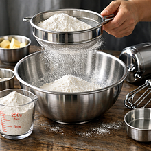 Użyj dużej, wysokiej miski, żeby łatwiej mieszać płyny z mąką. Jeśli nie masz sitka, możesz chwilę przesiać mąkę przez łyżkę, aby usunąć grudki.