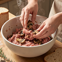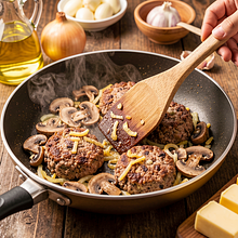 Klasyczne polskie kotlety mielone z dodatkiem drobno posiekanych pieczarek, które dodają wilgotności i delikatnej leśnej nuty. Przepis łączy tradycyjne smaki kuchni polskiej z prostą techniką zapewniającą soczystość – bułka namoczona w mleku, podsmażone pieczarki i krótkie wyrabianie masy. Kotlety świetnie smakują z tłuczonymi ziemniakami, młodą kapustą zasmażaną lub wiosenną sałatką ze szczawiem. Danie efektownie wygląda: złocista skórka, delikatne wnętrze z widocznymi kawałkami pieczarek, aromatyczne i sycące.
