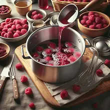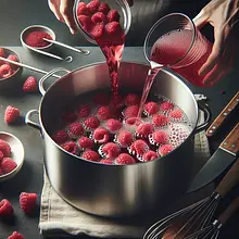 Do garnka wsyp maliny (600 g) i wlej 300 ml wody — to początkowa ilość, która zapobiega przypalaniu się owoców podczas podgrzewania. Postaw garnek na średnim ogniu. Delikatnie podgrzewaj przez 5 minut, mieszając drewnianą łyżką co 30–40 sekund, aż maliny puszczą sok i zrobi się intensywna, płynna masa. Nie doprowadzaj do intensywnego wrzenia — ma to być delikatne bulgotanie.