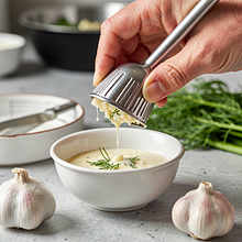 Obierz czosnek: weź 2 ząbki (10 g), połóż na desce, przyciśnij płaską stroną noża tak, aby skórka się poluzowała, a następnie obierz. Przeciśnij czosnek przez praskę lub drobno posiekaj nożem. Jeśli chcesz łagodniejszego smaku, zetrzyj czosnek na tarce i przetrzyj nożem, by rozbić ostre włókna.