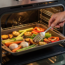 Wstaw blachę do rozgrzanego piekarnika i piecz 25–30 minut. Po 15 minutach wyjmij blachę i delikatnie przemieszaj warzywa łopatką tak, aby te na brzegach trafiły na środek. Piecz do momentu, gdy większość kawałków będzie miała złotobrązowe brzegi i miękki środek — sprawdź widelcem: powinien wchodzić łatwo w ziemniaka i marchew.