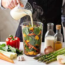 Wyjmij z piekarnika blachę i odstaw na 3–4 minuty, aby warzywa lekko ostygły. Wyciśnij miękki miąższ z upieczonych ząbków czosnku (trzymając łupinki) do dużej miski lub naczynia do blendowania. Przełóż wszystkie upieczone warzywa do naczynia blendera lub wysokiego naczynia do miksowania. Dodaj liście szczawiu (porwanе na mniejsze kawałki) oraz śmietanę i ocet jabłkowy.