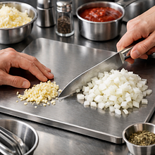 Przygotuj dodatki: pieczarki umyj papierowym ręcznikiem i pokrój w cienkie plasterki (ok. 2-3 mm). Szynkę pokrój w cienkie paski lub kostkę. Ser żółty zetrzyj na tarce o grubych oczkach — dzięki temu szybciej się roztopi i ładnie rozciąga.