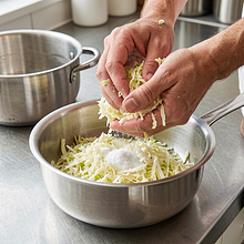 Poszatkowaną kapustę posyp 2 g soli (około 2 szczypty) i przez 2-3 minuty energicznie masuj dłonią (użyj czystych rąk lub rękawiczek kuchennych). Masowanie spowoduje, że kapusta puści sok, zmięknie i zmniejszy objętość — jej kolor stanie się bardziej szklisty i sprężysty.