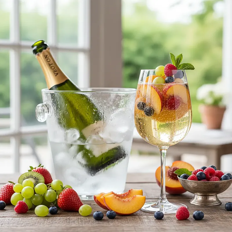 Podawaj w wysokich, wąskich kieliszkach typu 'flute', które pomagają utrzymać bąbelki. Można dodać długą, elegancką łyżeczkę koktajlową, aby goście mogli łatwo wyjeść owoce po wypiciu napoju. Napój najlepiej smakuje solo jako aperitif lub toast powitalny.