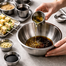 Przygotuj tofu: wyjmij blok tofu z opakowania, owiń ściereczką kuchenną lub papierowymi ręcznikami i połóż na twardej powierzchni. Na wierzch połóż talerz i obciąż (np. puszka lub ciężki słoik) — odstaw na 20–30 minut, żeby odsączyć nadmiar wody. To bardzo ważne, bo suche tofu lepiej chłonie marynatę i ładniej się zrumieni.