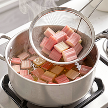 W małym garnku zagotuj 250 ml wody z 10 g miodu (ok. 1/2 łyżki) i wrzuć pokrojony rabarbar. Gotuj 1–2 minuty na średnim ogniu, aż kawałki zrobią się miękkie, ale nie rozpadną się. Odcedź na sitku i odstaw do wystudzenia — dzięki temu rabarbar będzie miękki i polubi się z glazurą.