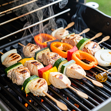 Aromatyczne szaszłyki z pierś z kurczaka i sezonowych warzyw: papryka, cukinia, pieczarka i cebula. Marynata na bazie olej rzepakowy, sok z cytryny i musztarda nadaje mięsu delikatności i lekkiej kwasowości, a opcjonalny miód wprowadza subtelną glazurę podczas grillowania. Danie idealne na majówkę i piknik — kolorowe, łatwe do przygotowania na grillu lub w piekarniku. Podawać z kasza jaglana lub sałatka z młodych warzyw oraz świeżą natka pietruszki. Szaszłyki są efektowne wizualnie, z kontrastem soczystego mięsa i chrupiących warzyw oraz wyraźnym, lekko dymnym aromatem.