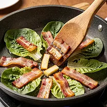 Pokrój boczek w paski o szerokości około 1 cm. Rozgrzej patelnię średniej wielkości (ok. 24-26 cm) na średnim ogniu - nie dodawaj tłuszczu (boczek puści własny tłuszcz). Wrzuć kawałki boczku na jedną warstwę i smaż bez przykrycia 6-8 minut, mieszając co 1-2 minuty drewnianą szpatułką, aż będą złociste i chrupiące. Jeżeli tłuszcz zaczyna pryskać zbyt mocno, zmniejsz ogień o 1 stopień.