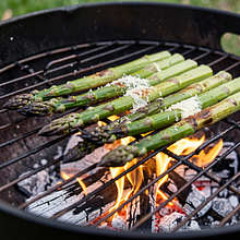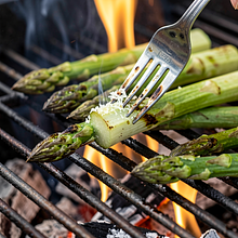 Ułóż szparagi na rozgrzanym ruszcie nad żarem. Piecz bezpośrednio nad żarem przez 6–8 minut dla cienkich pędów lub 8–12 minut dla grubych, obracając co 2–3 minuty, aby równomiernie zazłocić wszystkie strony. Poszukuj delikatnych czarnych przypaleń i jasnozielonego koloru — to oznaka prawidłowego przypieczenia.