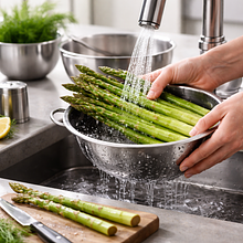 Opłucz szparagi pod zimną bieżącą wodą, potrząsając pędami, aby usunąć piasek. Połóż jedną szparagę na desce, przytrzymaj jedną ręką końcówkę przy główce, drugą ręką przy podstawie i delikatnie zegnij aż pęknie - miejsce pęknięcia wskaże twardą, włóknistą część. Ułóż wszystkie szparagi obok siebie i przytnij łamią miejsca lub odetnij 1–2 cm od końców, tak aby wszystkie miały równą długość. Jeśli pędy są grube (średnica >1,5 cm) obierz dolną 1/3 warzywa obieraczką do warzyw, przesuwając od środka pędu w dół.