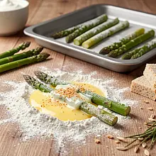 Weź jedną szparagę, oprósz ją równomiernie mąką (strzepnij nadmiar), zanurz w roztrzepanym jajku, a następnie obtocz w bułce tartej, dociskając lekko, aby panierka dobrze przylegała. Układaj paluszki pojedynczą warstwą na przygotowanej blasze. Powtarzaj z pozostałymi szparagami.