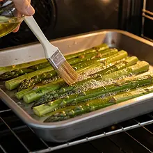Skrop paluszki cienką warstwą olej rzepakowy przy pomocy pędzelka lub spryskaj olejem. Wstaw blachę do nagrzanego piekarnika i piecz 12–15 minut. Po 8–9 minutach obróć paluszki delikatnie na drugą stronę, aby panierka równomiernie się zrumieniła. Gotowe paluszki powinny być złociste z zewnątrz, a szparagi miękkie lecz jędrne w środku.