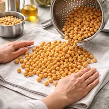 Przygotuj ciecierzycę: odsącz dokładnie z zalewy i rozłóż na czystej ściereczce kuchennej. Osusz energicznie, aby usunąć wilgoć — to klucz do uzyskania chrupkości. W misce wymieszaj suchą ciecierzycę z 15 g oliwy (1 łyżka), 5 g wędzonej papryki i 5 g kminu rzymskiego oraz 1 szczyptą soli. Rozłóż ciecierzycę w jednej warstwie na blaszce obok buraków, zostawiając między kawałkami przestrzeń.