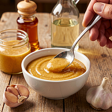 Przygotuj glazurę: w miseczce wymieszaj miód (100 g), musztardę (60 g), ocet jabłkowy (30 ml) oraz przeciśnięty przez praskę czosnek (15 g). Mieszaj łyżką aż masa będzie jednolita i lekko leista.