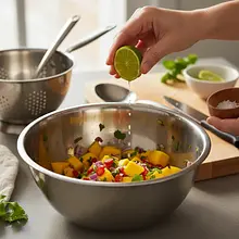 Dopraw salsę. Do miski ze składnikami wyciśnij sok z dwóch limonek. Dodaj około pół łyżeczki soli (2 szczypty). Całość delikatnie, ale dokładnie wymieszaj za pomocą łyżki, starając się nie rozgnieść kostek mango. Spróbuj i w razie potrzeby dopraw większą ilością soli lub soku z limonki. Odstaw salsę na co najmniej 15-20 minut do lodówki, aby smaki się połączyły.
