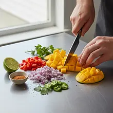 W czasie gdy ryba się marynuje, przygotuj salsę. Obierz mango i pokrój miąższ w drobną kostkę (około 1x1 cm). Czerwoną cebulę obierz i również pokrój w bardzo drobną kostkę. Papryczkę jalapeño przekrój wzdłuż, usuń gniazdo nasienne (chyba że lubisz bardzo ostre smaki) i posiekaj bardzo drobno. Świeżą kolendrę grubo posiekaj.