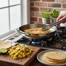 Oto kwintesencja lata na talerzu – lekkie, świeże i niezwykle kolorowe tacos z rybą, inspirowane słonecznymi plażami meksykańskiego półwyspu Baja California. Danie to jest idealnym balansem smaków i tekstur: chrupiące, delikatne kawałki białej ryby otulone w ciepłą, kukurydzianą tortillę, dopełnione słodyczą dojrzałego mango, ostrością papryczki chili i czerwonej cebuli, a wszystko to przełamane kwasowością limonki i świeżością kolendry. Kremowe awokado dodaje gładkości, a chrupiąca czerwona kapusta zapewnia dodatkową teksturę. To danie nie tylko zachwyca smakiem, ale również wyglądem, tworząc na talerzu prawdziwą fiestę barw. Idealne na lekki obiad, kolację w gronie przyjaciół czy jako gwiazda letniej imprezy. Podawaj je od razu po przygotowaniu, aby cieszyć się pełnią ich smaku i chrupkości.