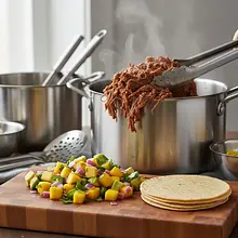 Zacznij od przygotowania marynaty. Jedną dużą cebulę (ok. 200g) obierz i pokrój w grubą kostkę. Czosnek obierz. Do kielicha blendera lub wysokiego naczynia (jeśli używasz blendera ręcznego) włóż pokrojoną cebulę, obrane ząbki czosnku, papryczki chipotle wraz z łyżką sosu adobo, wlej sok z limonek, ocet jabłkowy i rosół. Dodaj kmin rzymski, oregano, mielone goździki, 10g soli (ok. 2 płaskie łyżeczki) i świeżo mielony pieprz. Zmiksuj wszystko na gładką, jednolitą pastę. Powinna mieć intensywny, dymny zapach.