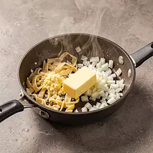 Na małej patelni rozgrzej 15 g masła (1/2 łyżki) na średnim ogniu. Dodaj posiekaną cebulę i smaż 4-5 minut aż stanie się miękka i lekko złota. Dodaj starty lub drobno posiekany imbir i smaż 30 sekund, aż uwolni aromat.