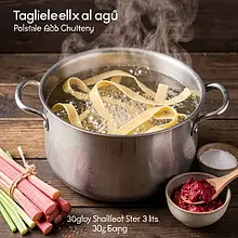 Na talerzu ułóż porcję tagliatelle oblanych ragù, obok lub częściowo na wierzchu nałóż 1-2 łyżki rabarbarowego chutneyu jako kontrastujący akcent. Posyp obficie startym parmezanem (opcjonalnie) i do dekoracji połóż kilka listków szczawiu.