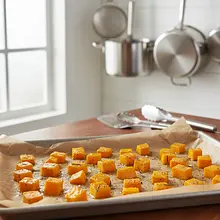 Przełóż kawałki dyni na dużą blachę wyłożoną papierem do pieczenia. Skrop je równomiernie oliwą z oliwek, a następnie posyp solą i świeżo mielonym pieprzem. Dokładnie wymieszaj wszystko dłońmi, tak aby każdy kawałek był pokryty przyprawami. Rozłóż dynię w jednej warstwie na blasze i wstaw do nagrzanego piekarnika. Piecz przez około 25-30 minut, aż dynia będzie całkowicie miękka (sprawdź wbijając w nią widelec – powinien wchodzić bez oporu) i lekko zrumieniona na brzegach.