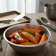 Do miski z batatami dodaj około 2 łyżki oliwy z oliwek (30 ml), oberwane z gałązek listki świeżego rozmarynu i tymianku, solidną szczyptę soli (ok. 3g) i świeżo mielony pieprz. Dokładnie wymieszaj wszystko dłońmi, tak aby każdy kawałek batata był równomiernie pokryty oliwą i ziołami. Rozłóż bataty w jednej warstwie na jednej z przygotowanych blach.