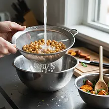 Gdy bataty się pieką, przygotuj ciecierzycę. Odsącz ją z zalewy na sicie i bardzo dokładnie opłucz pod zimną, bieżącą wodą. Następnie kluczowy krok: osusz ją jak najdokładniej. Możesz rozłożyć ją na czystej ściereczce kuchennej lub ręczniku papierowym i delikatnie potrzeć, aby usunąć jak najwięcej wilgoci.
