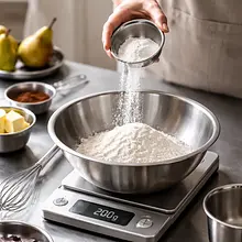 Przygotuj składniki: odmierz mąkę 200 g i wsyp do dużej, suchej miski. Dodaj 30 g cukru pudru i szczyptę soli (1 g). Zimne masło 100 g pokrój w kostkę ok. 1 cm (upewnij się, że masło jest prosto z lodówki). Do mąki dodaj pokrojone masło i szybko rozcieraj palcami lub użyj siekacza/robota kuchennego na krótkich pulsach, aż mieszanina przypominać będzie gruboziarnistą bułkę tartą (małe grudki masła wielkości ziaren grochu).