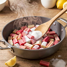 Przygotuj rabarbar: obierz (jeśli skórka jest twarda) i pokrój łodygi na kawałki 2 cm. Wrzuć do średniej patelni razem z 90 g cukru i startą skórką z cytryny. Podgrzewaj na średnim ogniu, mieszając co chwilę, aż rabarbar puści sok i zacznie mięknąć (6-8 minut).