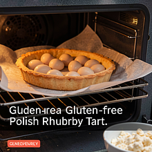 Delikatna tarta z sezonowym rabarbarem, przygotowana na bezglutenowym kruchym spodzie z mąki jaglanej i ryżowej. Połączenie lekko kwaskowego rabarbaru z kremową śmietaną i subtelną słodyczą cukru tworzy kontrast tekstur: kruche ciasto, wilgotne aromatyczne nadzienie i chrupiące płatki migdałowe jako opcjonalne wykończenie. To współczesna odsłona polskiego deseru wiosennego — idealna na popołudniowe spotkanie, podwieczorek lub świąteczny stół. Podawać lekko schłodzoną, z łyżką gęstego jogurtu naturalnego lub lodami waniliowymi; wygląda efektownie na talerzu dzięki różowym kawałkom rabarbaru i złocistej skorupce.
