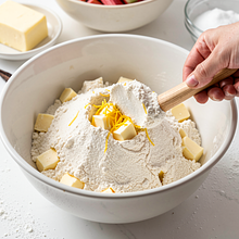 W dużej misce wsyp 250 g mąki pszennej i 50 g cukru (część całkowitego cukru). Dodaj 1 g soli oraz startą skórkę z cytryny i ziarna wanilii. Wrzuć zimne 125 g masła (pokrojone w kostkę). Rozetrzyj masło z mąką palcami lub użyj siekacza do ciasta, aż masa przypominać będzie drobną kruszonkę z kilkoma większymi kawałkami masła (czas pracy 2-3 minuty). Zrób wgłębienie, wbij jedno jajko (60 g) i szybko zagnieć krótko ciasto — tylko do połączenia składników, nie wyrabiaj zbyt długo (ok. 1-2 minuty). Uformuj dysk, owiń folią i włóż do lodówki na min. 30 minut.